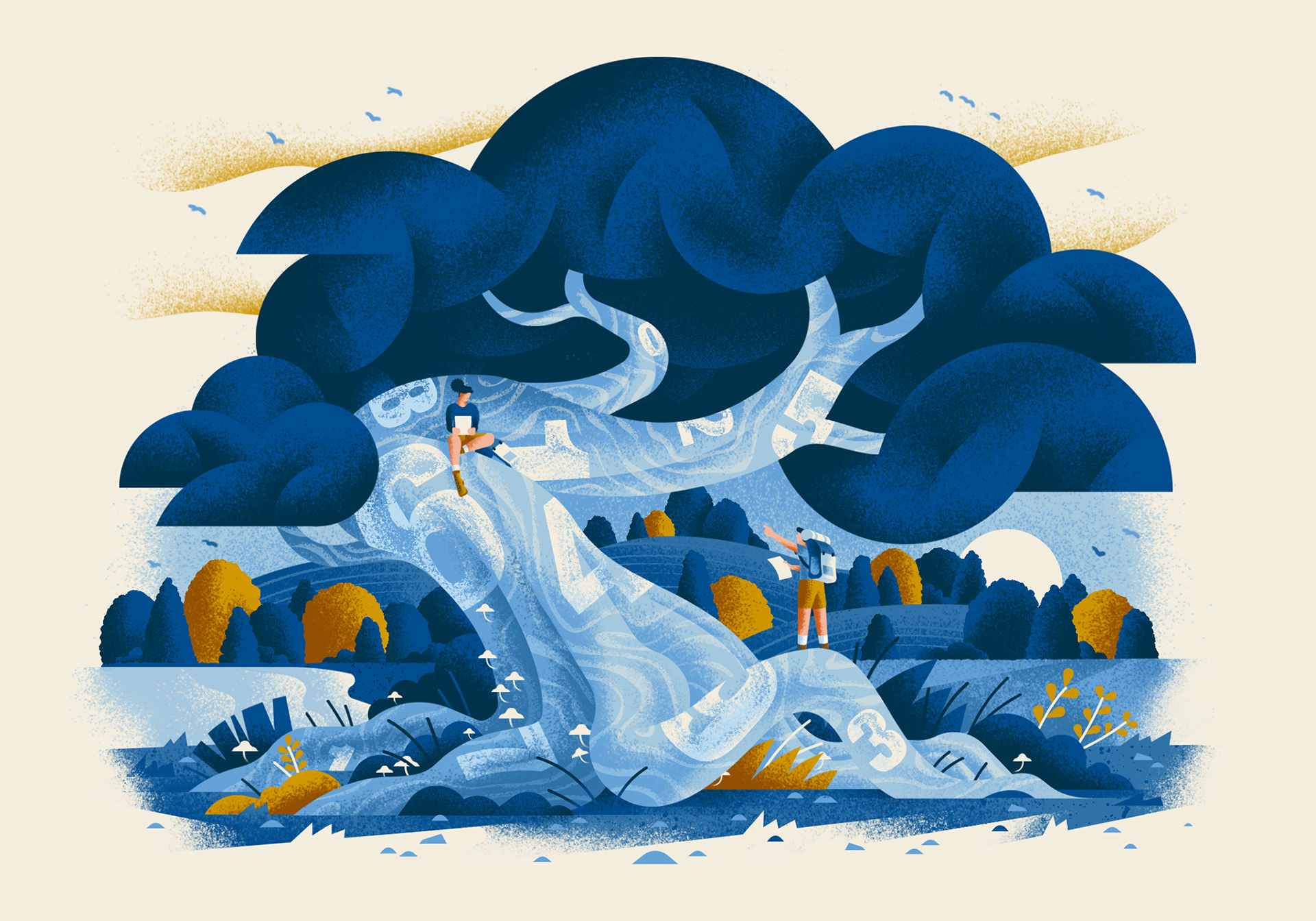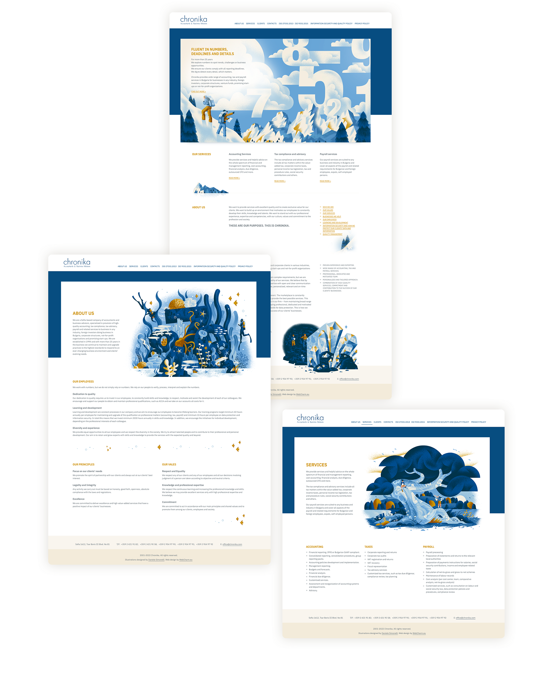 Chronika is a Sofia-based company of accountants and business advisors, they approached me in early 2022 to design a set of illustrations for their website, where they claim to have explored the world of numbers for more than 25 years. Keeping it in mind, I designed a set of 4 illustrations, telling the story of two brave characters roaming the world in search of wild numbers to be tamed.