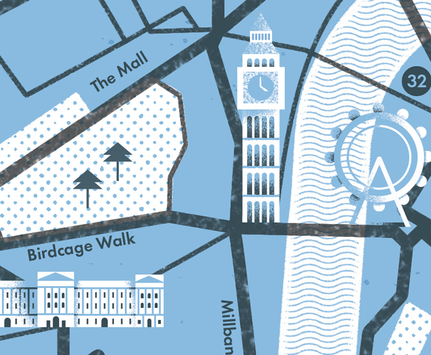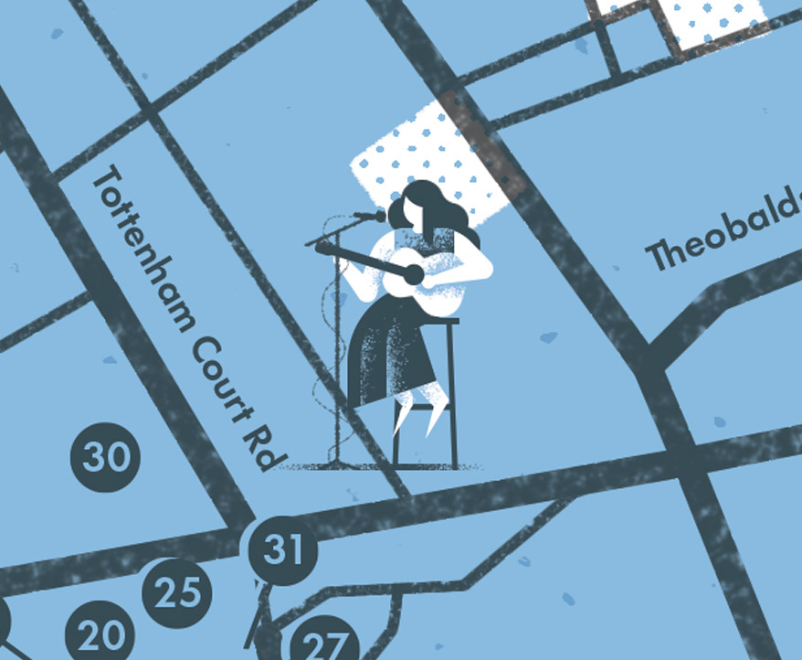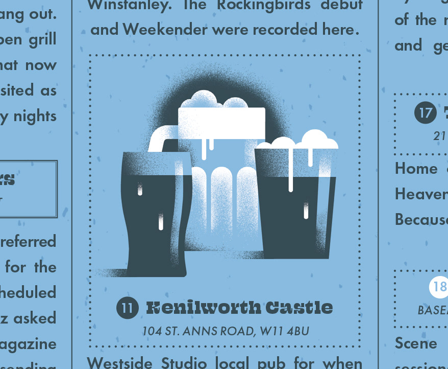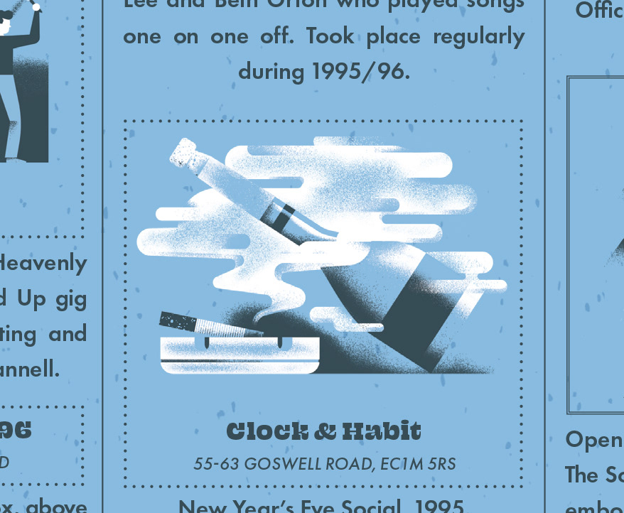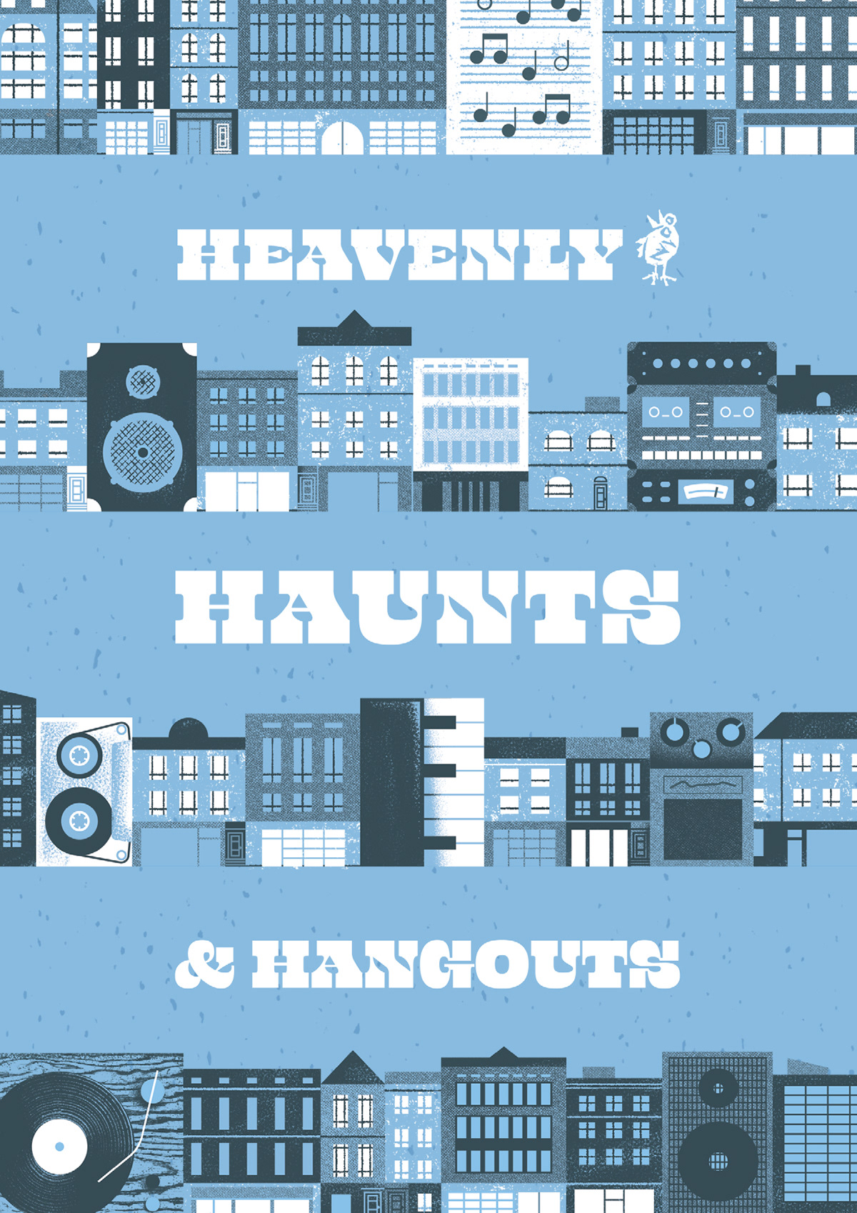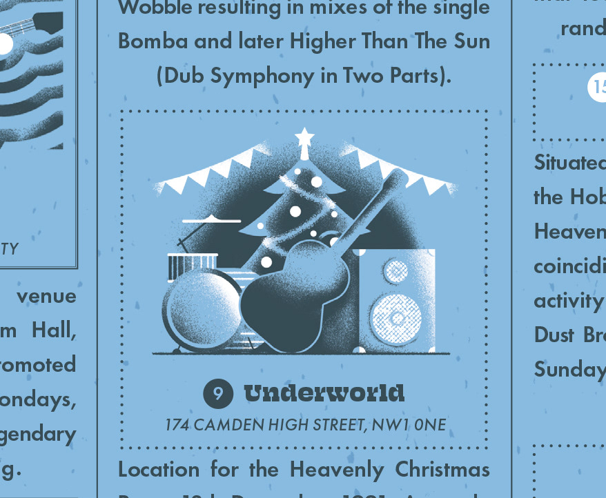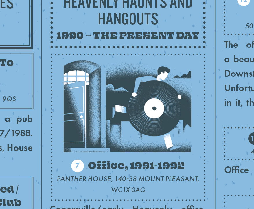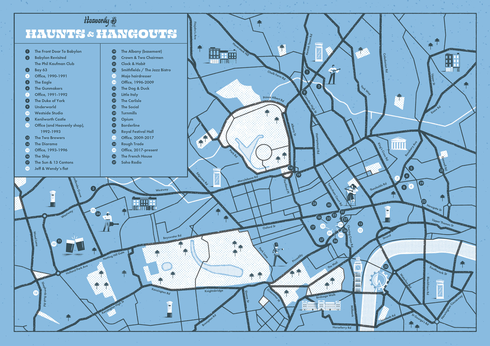 Foldable map designed with Herb Lester Associated and included in the Believe in Magic - Heavenly Recordings - The First 30 Years book by Heavenly Recordings, featuring some of the most notable places lived and loved by the label in London.