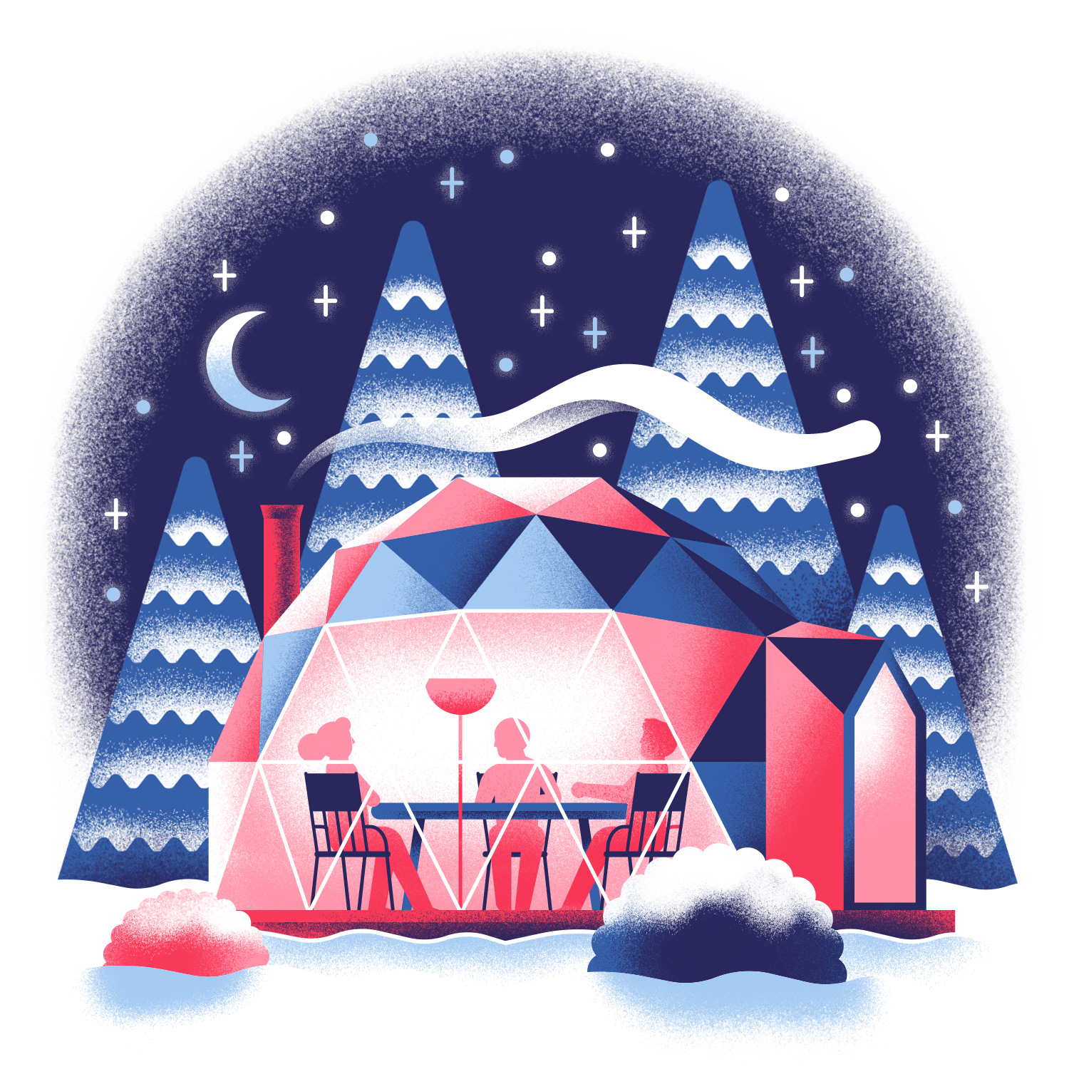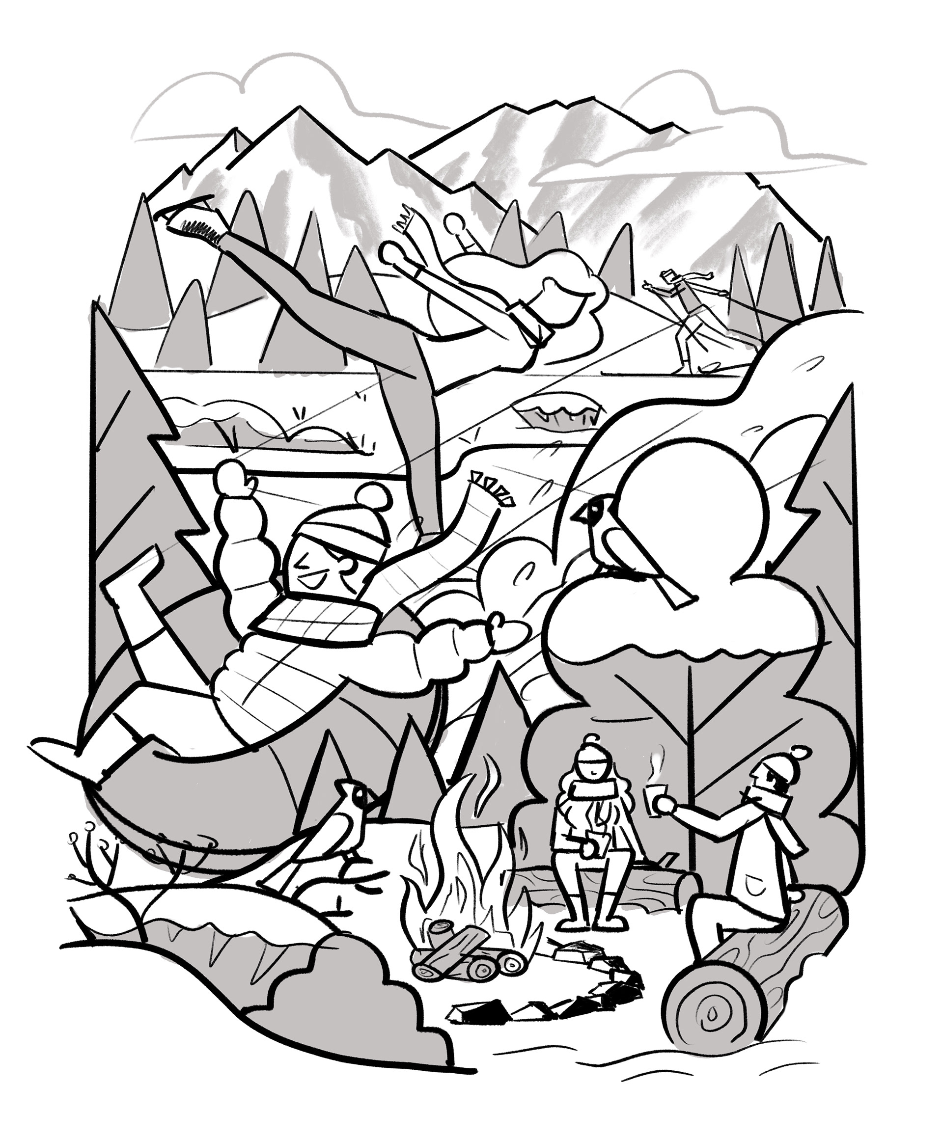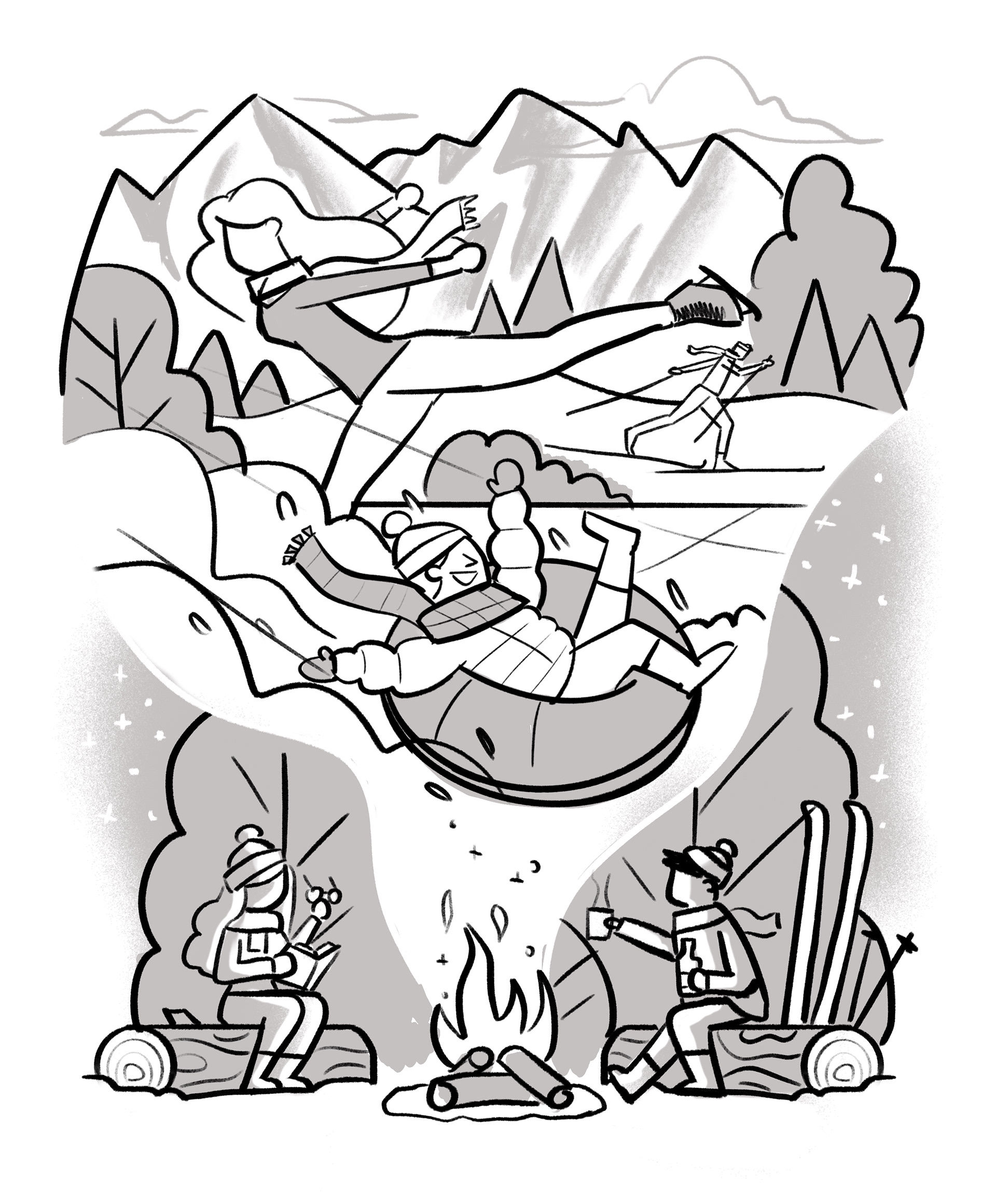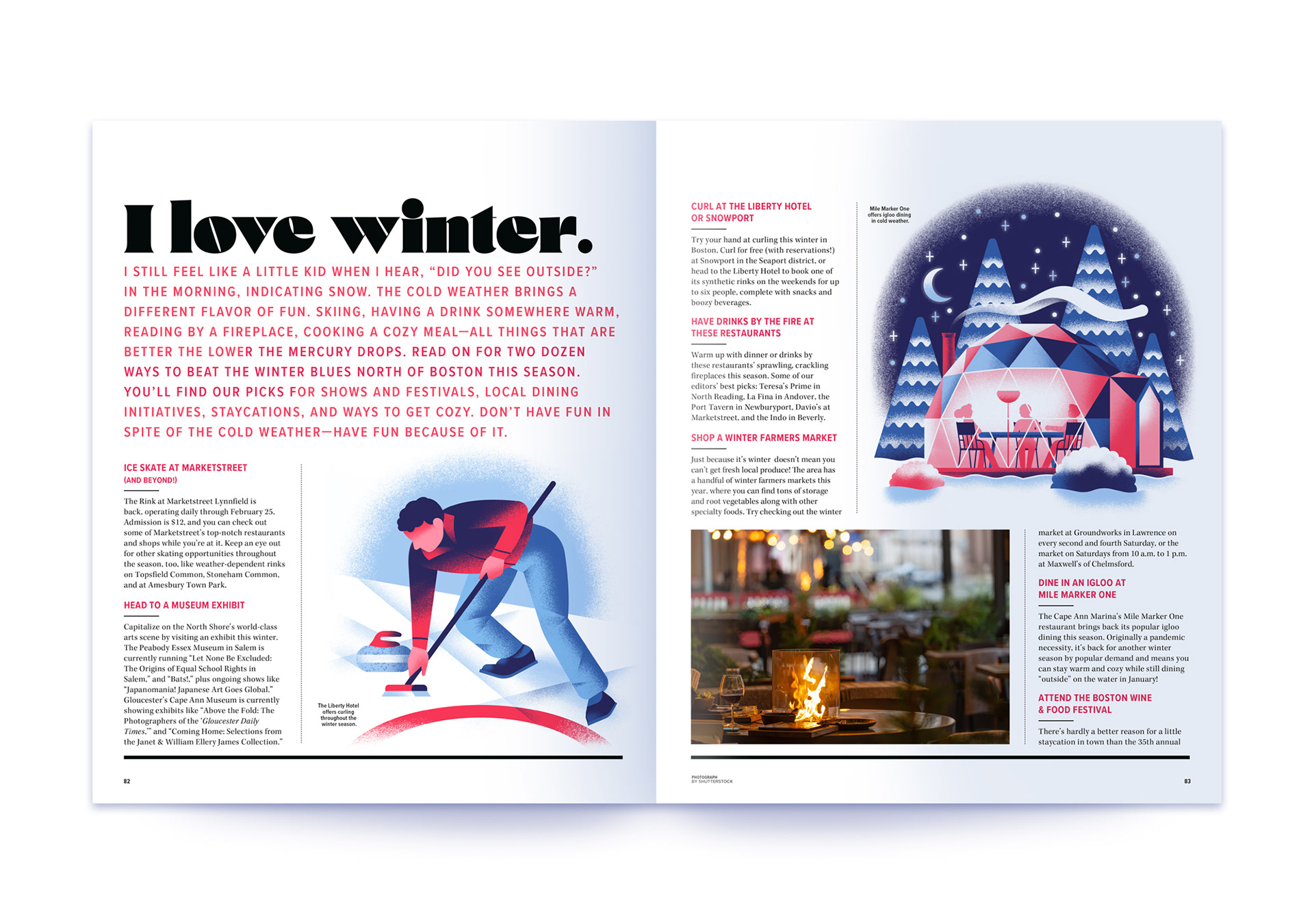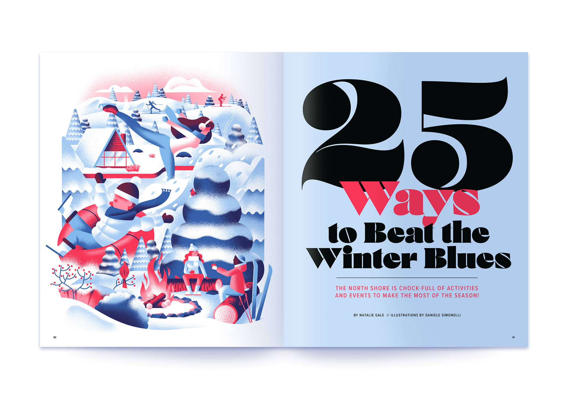 Editorial illustration for the article "25 ways to beat the winter blues" on Northshore Magazine.