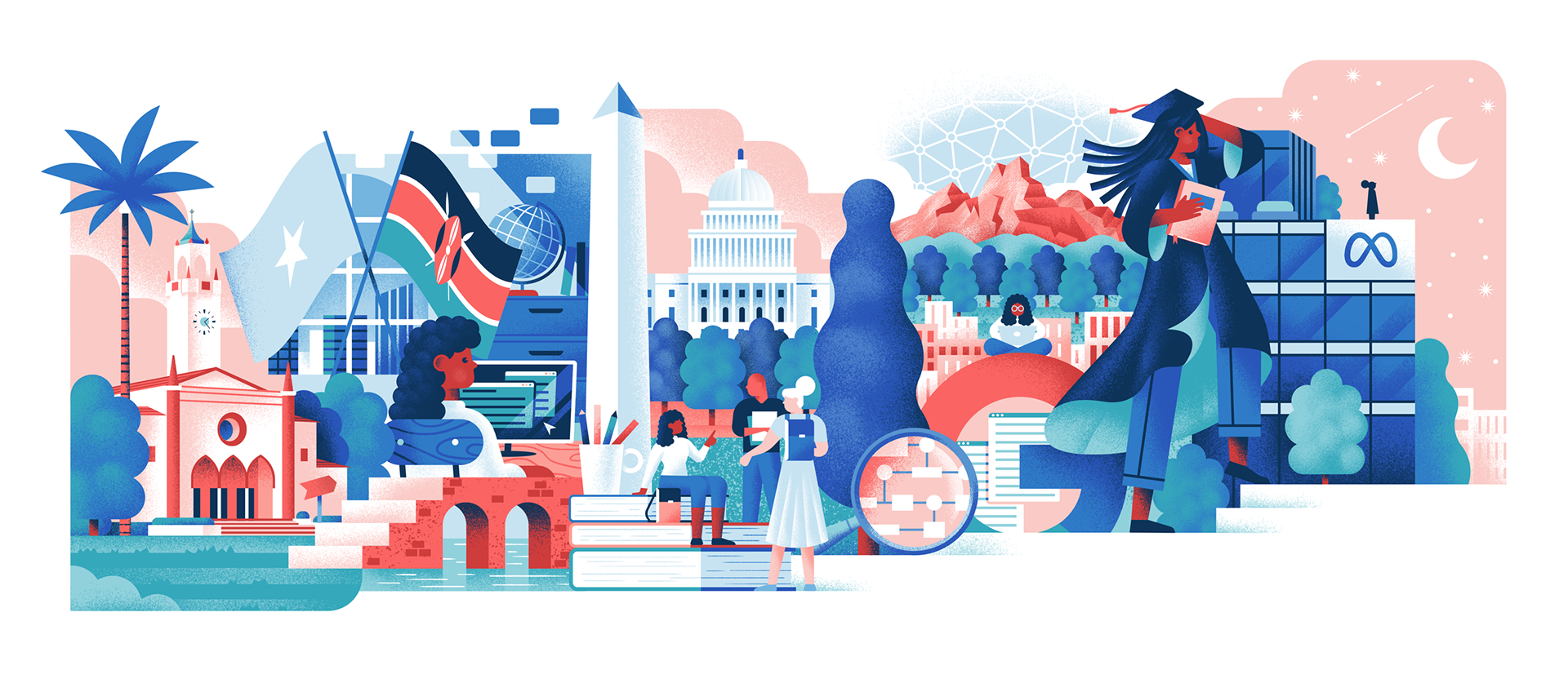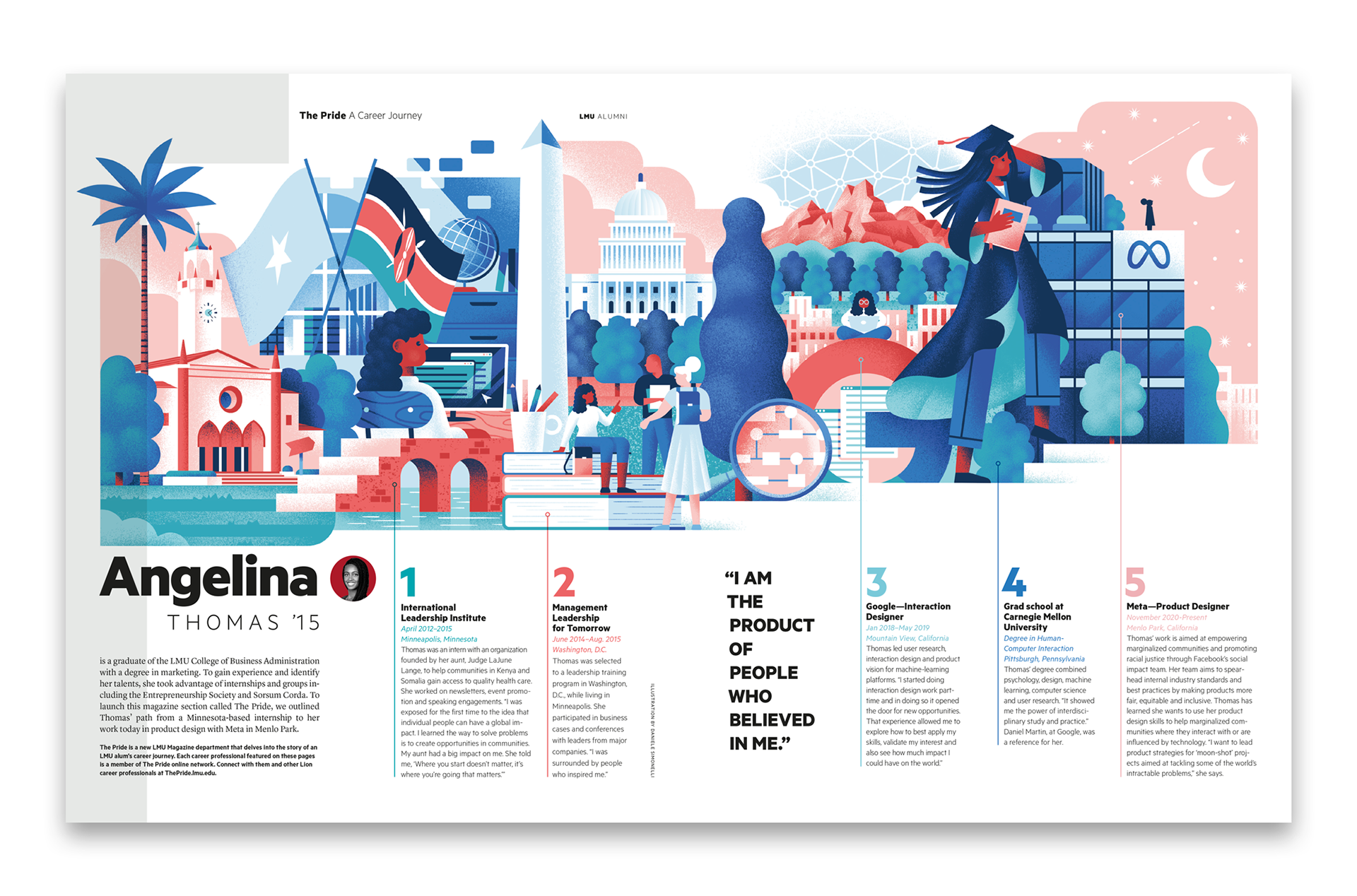 Editorial illustration designed under the art direction of the Austin office of Pentagram for the launch of a new department in the Loyola Marymount University Magazine called "The Pride", which maps the career path of a graduate.