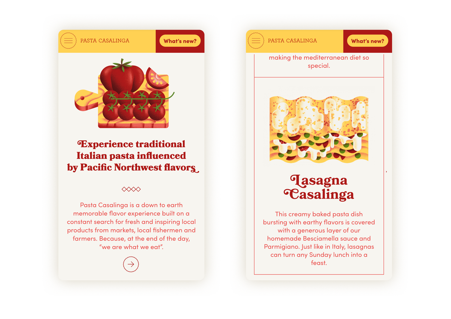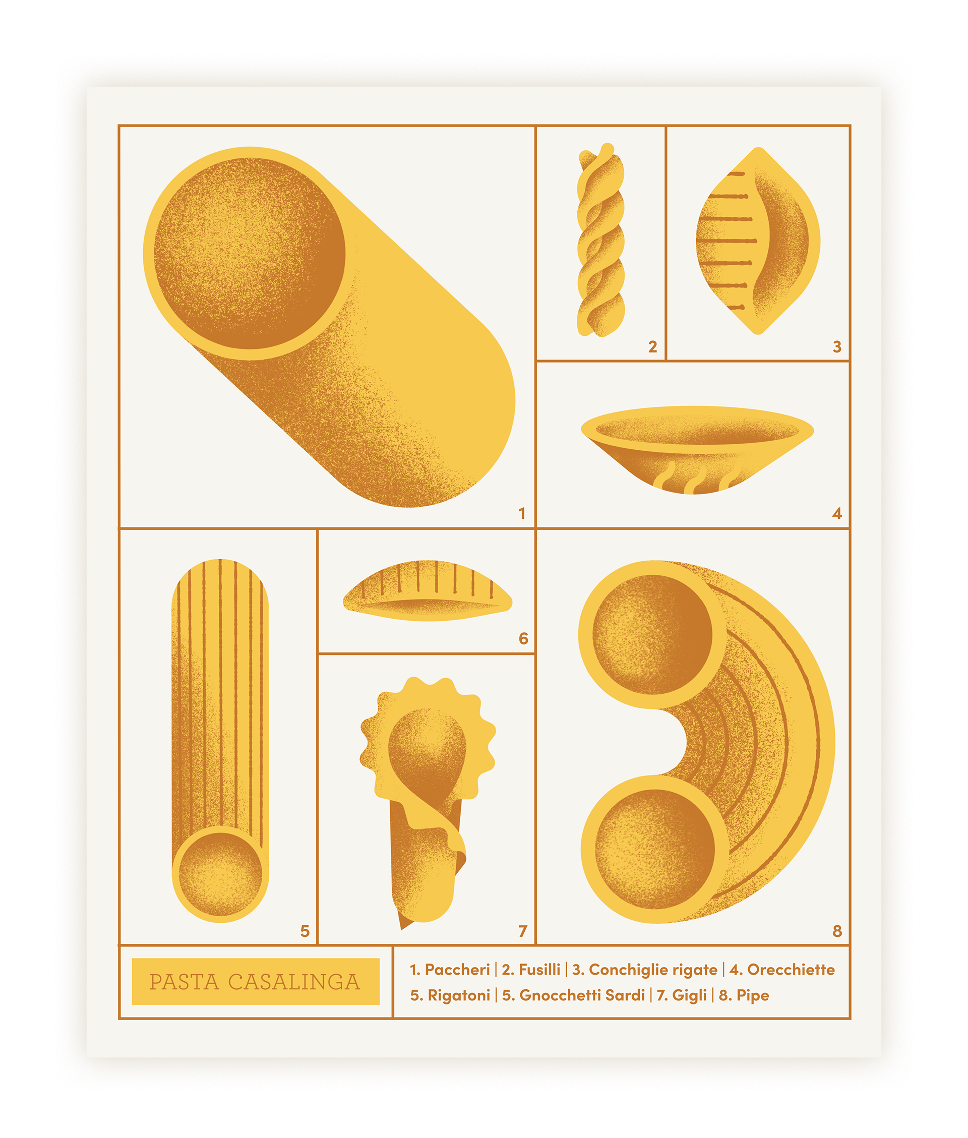 Pasta Casalinga is a down to earth memorable flavor experience built on a constant search for fresh and inspiring local products from markets, local fishermen and farmers. United by a common passion for top quality ingredients and all the stories behind them, Italian born and raised Michela and northwestern soul Nathan are the joyous crafters behind Pasta Casalinga: everyday they handcraft a wide range of pasta types and cook signature dishes mixing the best local products from the Pacific Northwest with Italian traditions. For the redesign of their website, Marianna Rossi asked me to produce some illustrations representing the environments from where their fresh products come from, along with some dishes and pasta shapes.