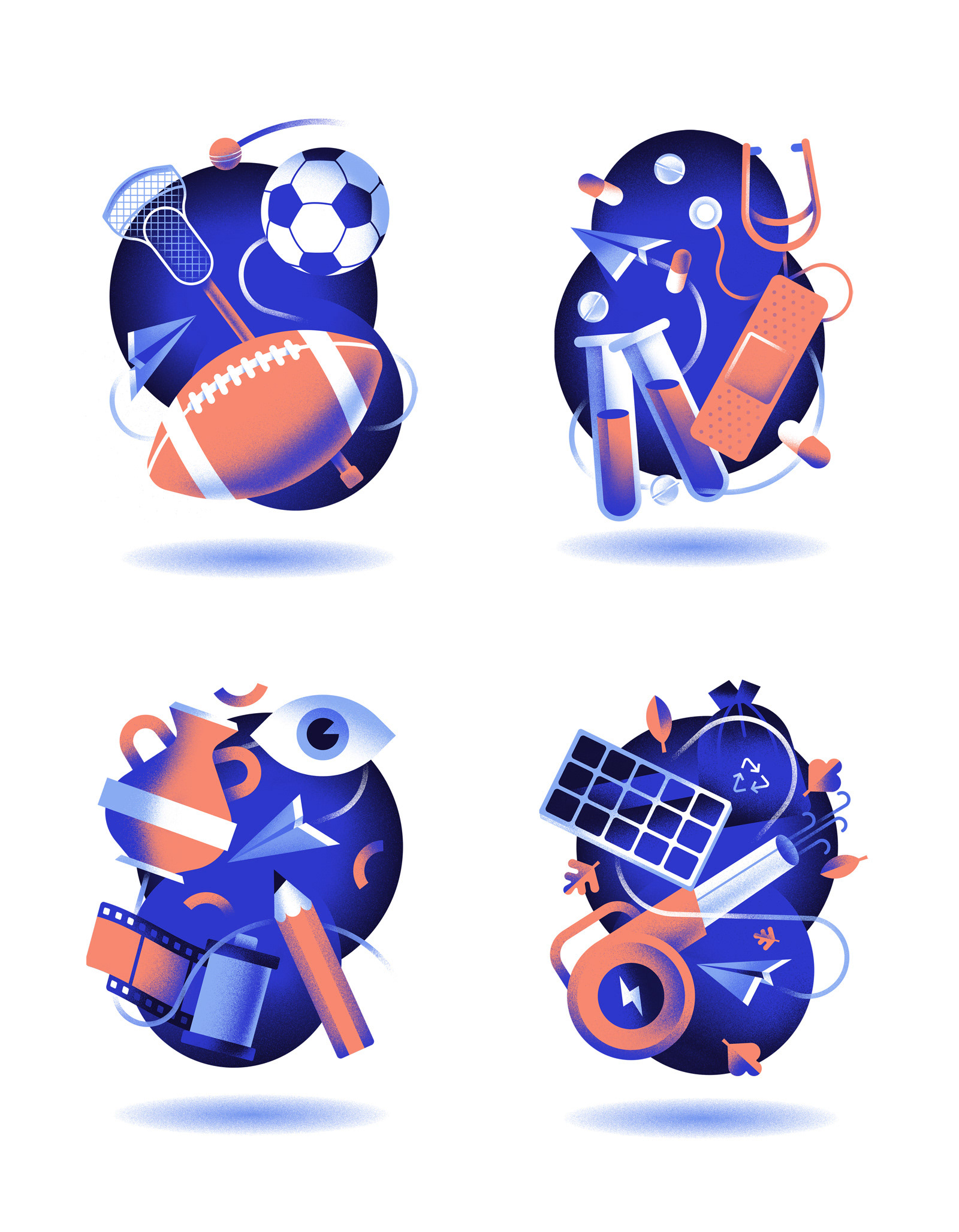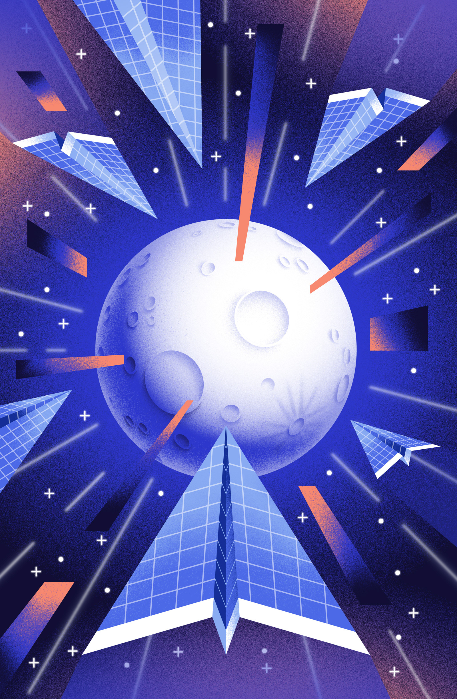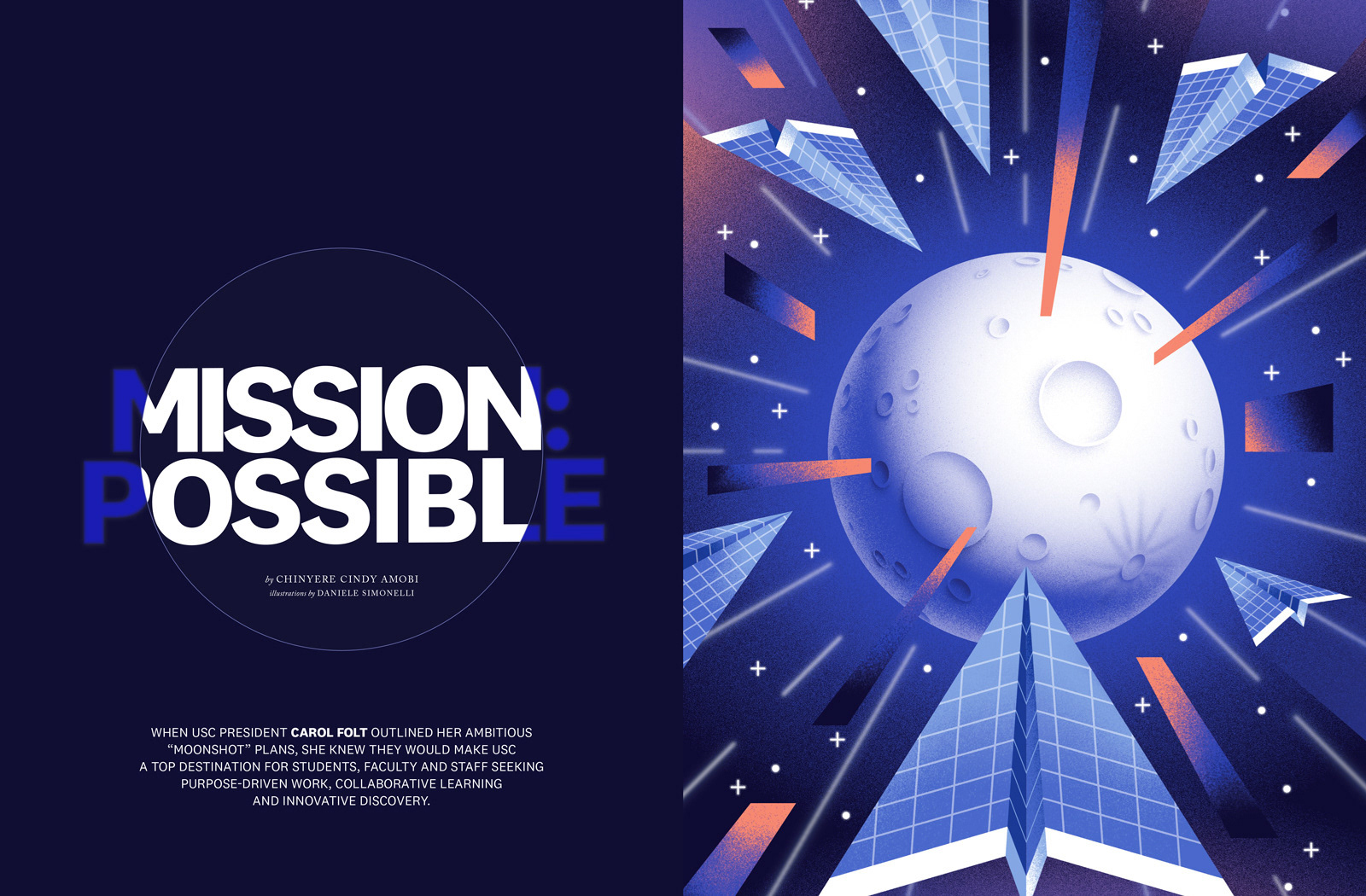 Editorial illustrations for the University of Southern California Trojan Family Magazine on the article: “Mission: Possible. When USC president Carol Folt outlined her ambitious “Moonshot” plans, she knew they would make USC a top destination for students, faculty, and staff seeking purpose-driven work, collaborative learning, and innovative discovery.” Art direction by the Pentagram studio based in Austin