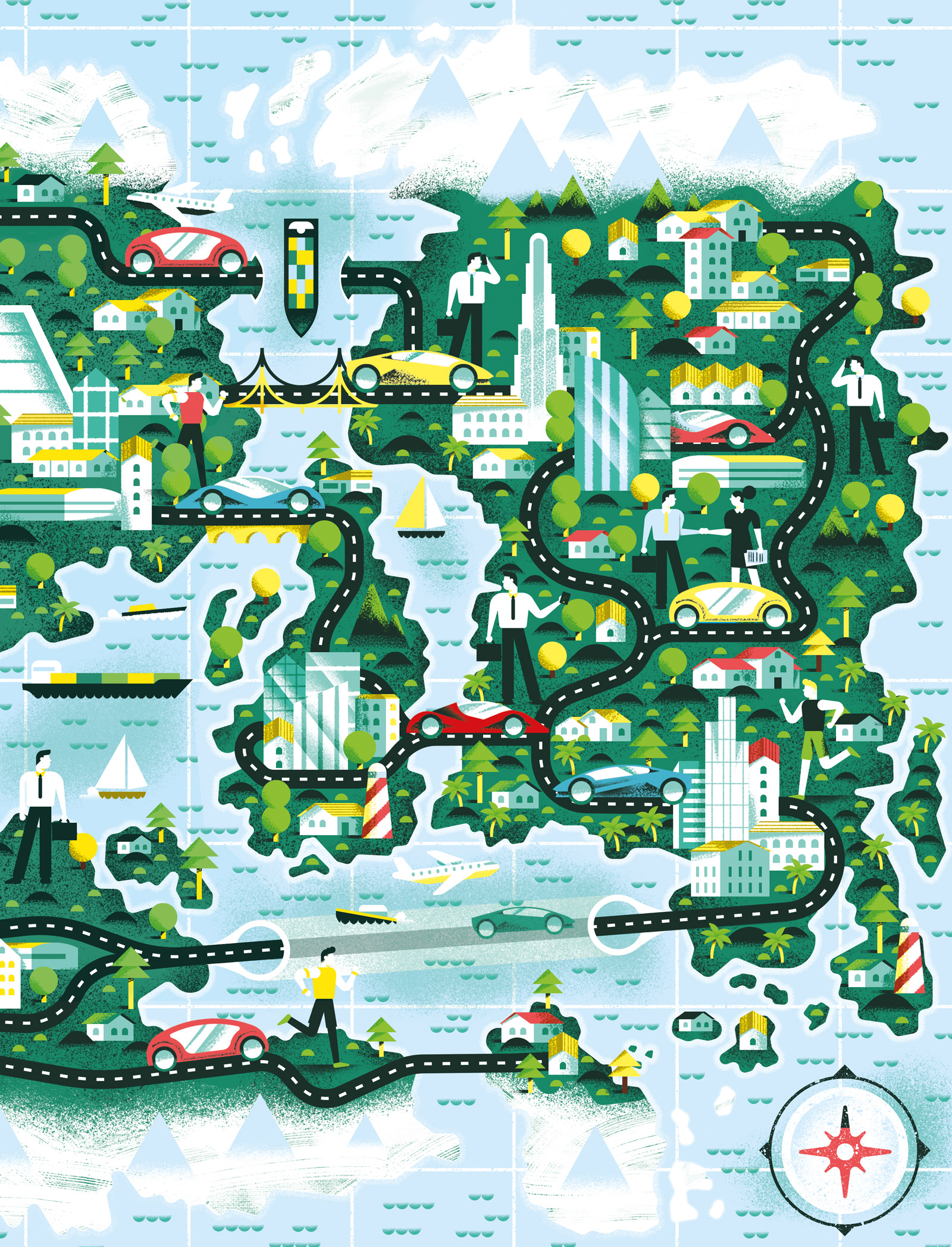 Cover illustration for the 22nd issue of The Good Life Italia, map about the cars market in the future.